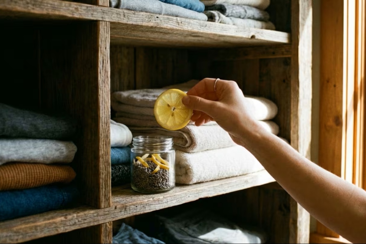 O limão contém ácido cítrico e óleos essenciais com propriedades desodorizantes e antibacterianas. Vários estudos relacionados à limpeza natural da casa indicam que esses compostos ajudam a neutralizar os microrganismos responsáveis pelos maus odores e a refrescar espaços fechados. No caso do armário, o limão atua absorvendo odores de humidade, confinamento ou roupas guardadas, sem a necessidade de usar aerossóis químicos ou fragrâncias artificiais que podem impregnar os tecidos.