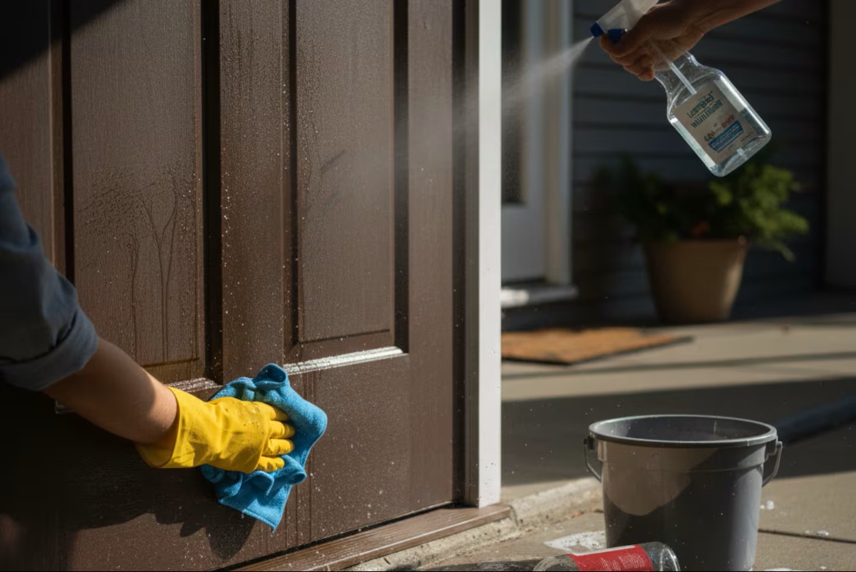 2. Pulverize ou limpe a porta e os batentes com um pano, prestando especial atenção à parte inferior e aos cantos.