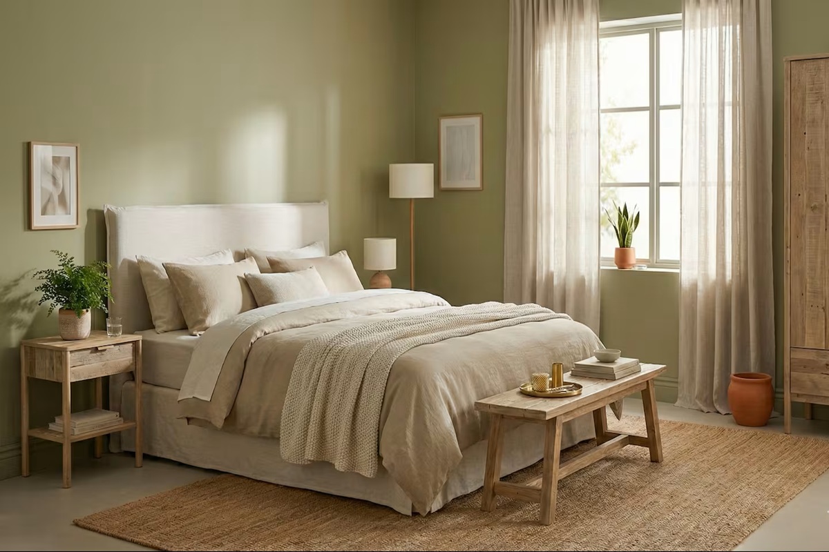 A terceira opção cria uma atmosfera descontraída e natural. O verde azeitona, combinado com tons areia e branco sujo, cria uma atmosfera harmoniosa e tranquila.