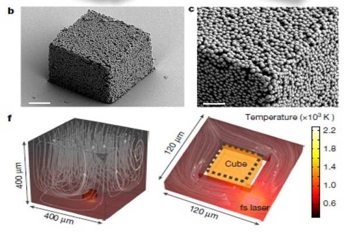 A base do processo é tão delicada quanto poderosa. Um laser de femtossegundo foca num ponto microscópico dentro de um líquido cheio de partículas. Este impulso ultrarrápido gera um gradiente térmico local, que, por sua vez, provoca um fluxo convectivo no líquido. Não se trata de um simples movimento da água: é um fluxo direcionado que empurra e ordena as partículas num determinado local. Muito perto desse «ponto quente» encontra-se uma microestrutura polimérica, pré-impressa com 2PP, uma espécie de forma oca com uma pequena abertura lateral. Através dessa fenda, as partículas, direcionadas pelo fluxo de luz, entram e acumulam-se até preencherem completamente a forma.