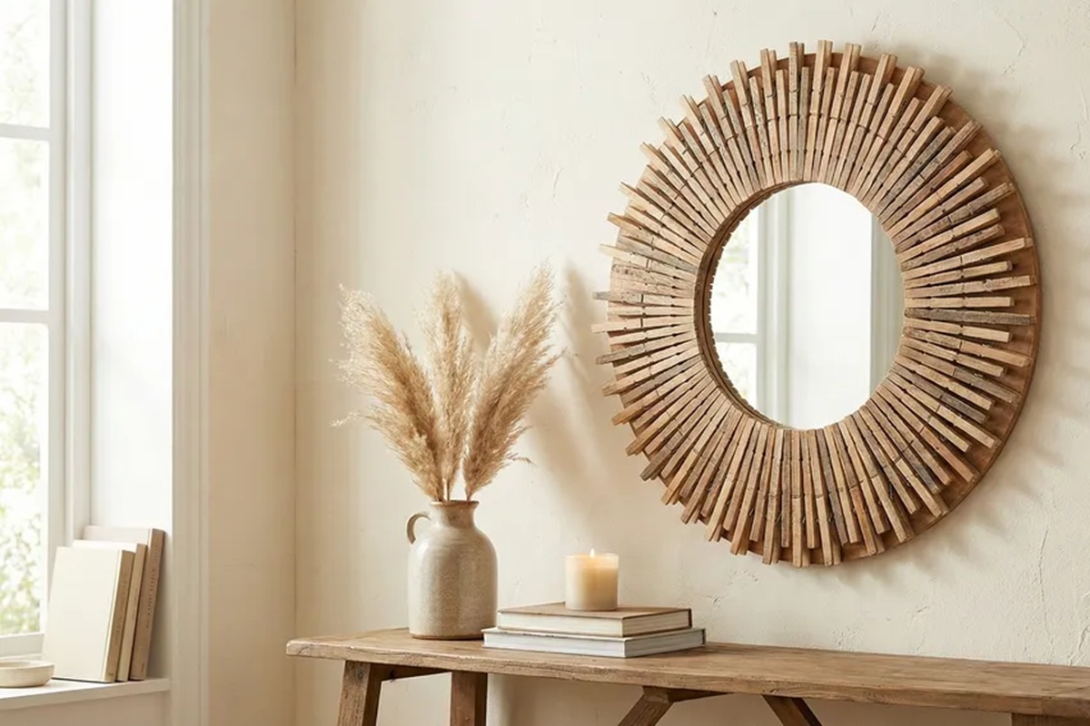 Os prendedores de roupa velhos, de madeira ou plástico, costumam partir-se ou ficar desiguais e acabam esquecidos numa lata ou gaveta. No entanto, devido à sua forma simples e ao seu material leve, podem passar por uma reciclagem e se transformar num espelho decorativo tipo sol, uma decoração original que adiciona design e personalidade a qualquer ambiente.